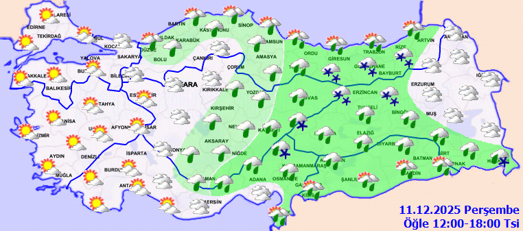 Laut Vorhersage der Generaldirektion für Meteorologie wird es im Norden, Zentrum und Osten des Landes teils bewölkt sein. In der nordöstlichen Marmararegion, im östlichen Mittelmeerraum (ohne Mersin), im Norden und Osten Zentralanatoliens, in der Schwarzmeerregion, im Süden und Westen Ostanatoliens sowie in Südostanatolien ist mit Niederschlägen zu rechnen. Diese fallen überwiegend als Regen und Schauer, vereinzelt auch als Schneeregen. In den höheren Lagen der östlichen Schwarzmeerregion und Ostanatoliens ist mit Schneefall zu rechnen. In der südlichen Marmararegion sowie im Zentrum und Osten des Landes ist nachts und morgens mit Nebel und Dunst zu rechnen.